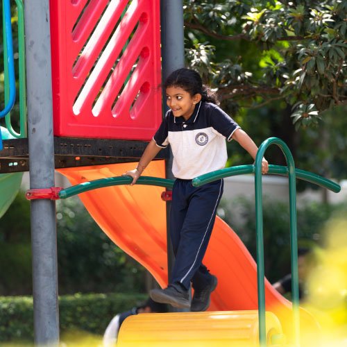 On the left-hand side of our campus, is our popular Science Park, a feature found in very few schools near ITPL. It contains many unique scientific exhibits and models related to traditional and modern scientific and technological research. Scientific theories and laws can be better understood by practical application using the life-like models within the park. Preschool and Primary students are provided with a well-equipped play area complete with colorful swings, slides, seesaws, climbing frames, and a sand slot. Secondary and Middle School students have a wide sports field where they are free to run to their heart's content.